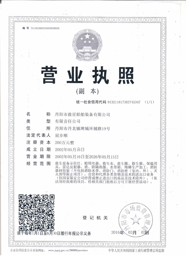 丹陽市救星船舶裝備有限公司為丹陽市船舶救生照明設備廠子公司,主要生產救生設備示位燈、雷達反射器、引航員軟梯、登乘梯等產品。其中救生設備示位燈采用國際上最先進的科學技術、生產工藝,優(yōu)質材料制造,各項技術指標超過國際先進水平,完全滿足國際最新標準。2012年元月取得“CCS”型式認可證書,并具有歐共體“EC”證書。另外本公司制造的RDF400雷達反射器還獲得了實用新型專利。